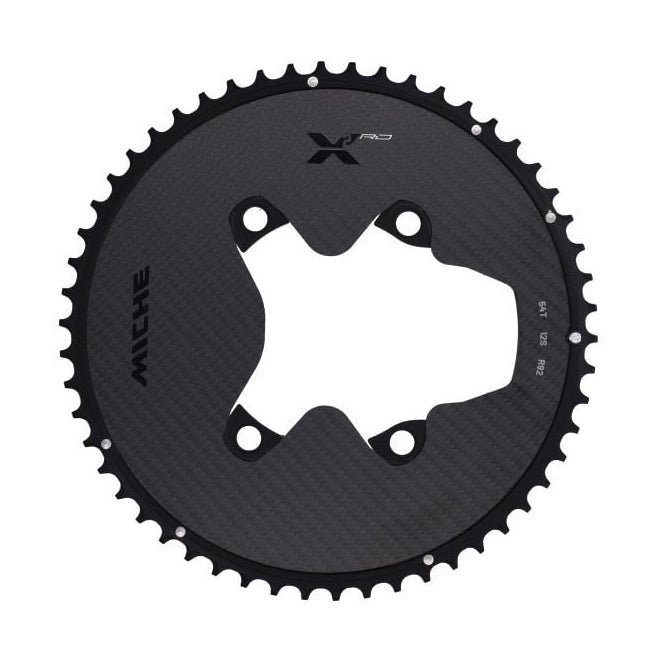 With beautiful Miche X2 carbon chainrings, you can really get up to speed on your road bike with Shimano Dura-Ace 9200 cranks. The chainrings are made from CNC-machined 7075-T6 aluminium and a bonded carbon disc. This sandwich construction ensures that the chainrings are highly rigid so that every watt on the pedals can be efficiently converted into propulsion, while this construction keeps the weight low.